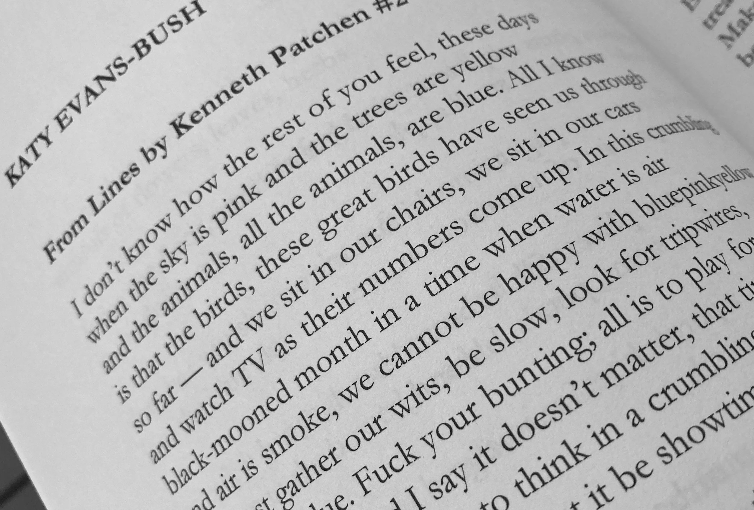 The morning after the cutting-up session I arranged four or five of Patchen’s phrases very quickly & matter-of-factly, like someone laying out tarot cards, one under another. A poem came bursting out round and through them. Three in a row. The next day four came in an hour. And so on. I would just keep going each time till the tap slowed to a trickle. It slowed down, of course, but seven months later, I have 41 poems, and over ten have been published. These phrases of Patchen’s have sparked a conversation with him, and myself, about politics, personal responsibility, death, bereavement, climate change, war, abortion rights, birds, flowers… They’ve got me writing in a looser & more open style, more like myself in fact. The device has served me really well in a year of awful upheavals — just when we thought the world might be beginning to recover from its recent trauma.